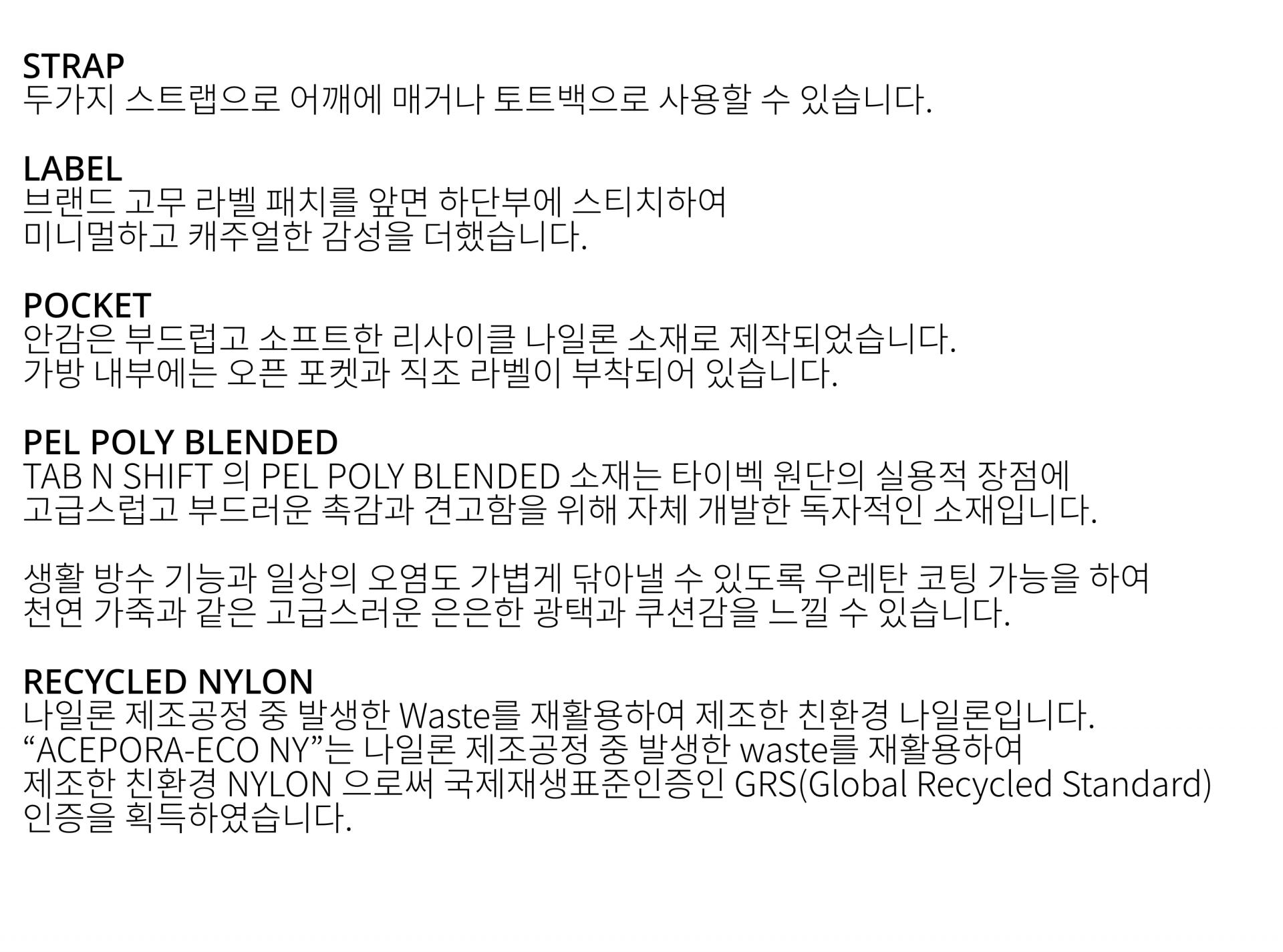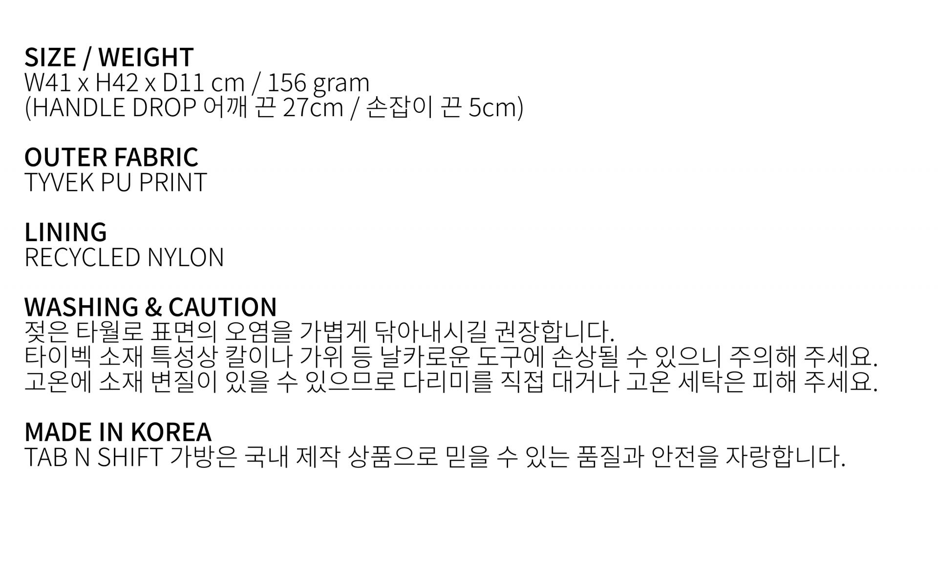탭앤쉬프트가 자체개발한 "PEL Poly TYVEK"은 타이백의 고유한 기능들과 질감을 살리고 내구성을 강화시킨 패브릭으로 제작되었습니다.